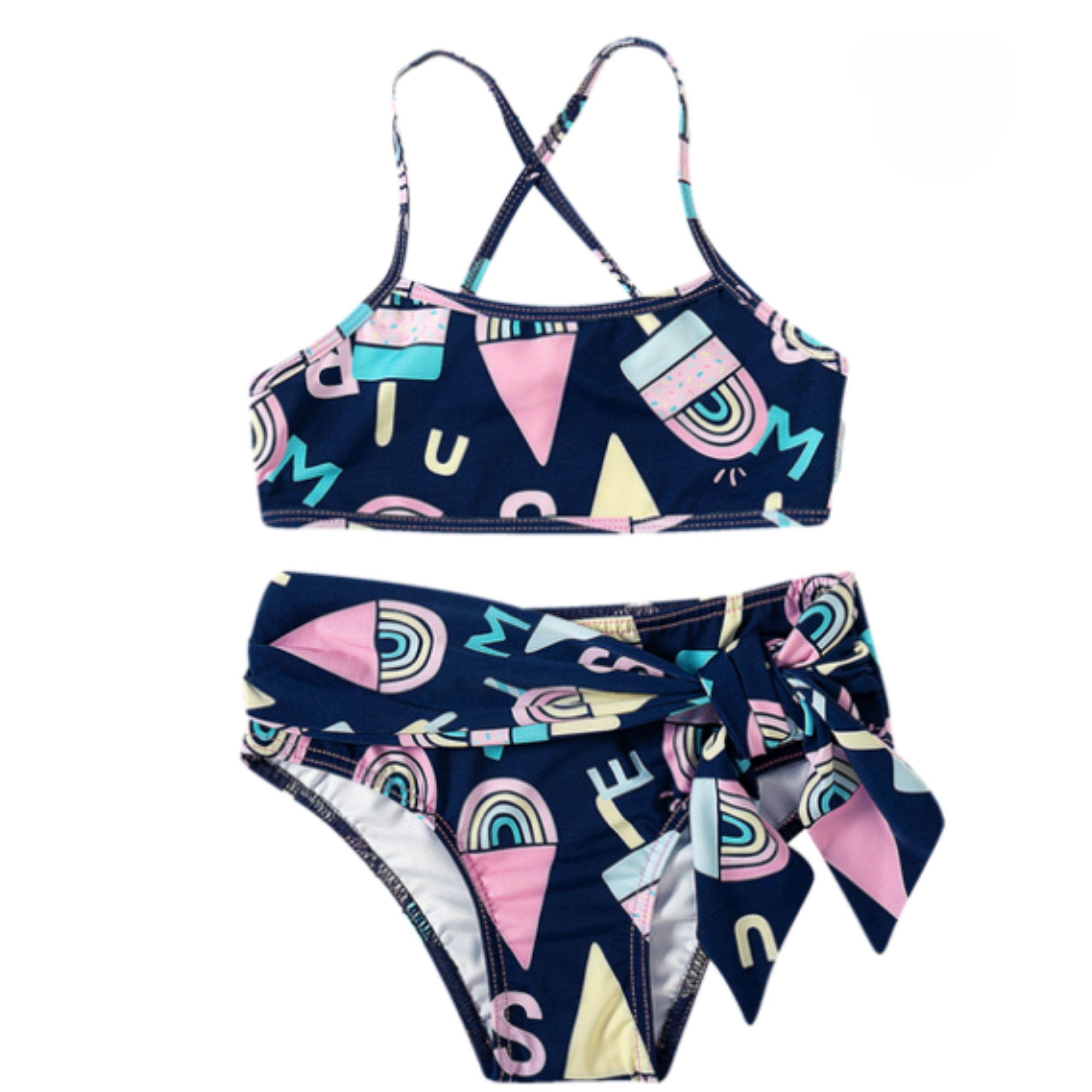 A estampa colorida com sorvetes é super fofa. A alça cruzada nas costas ajuda no ajuste do top.